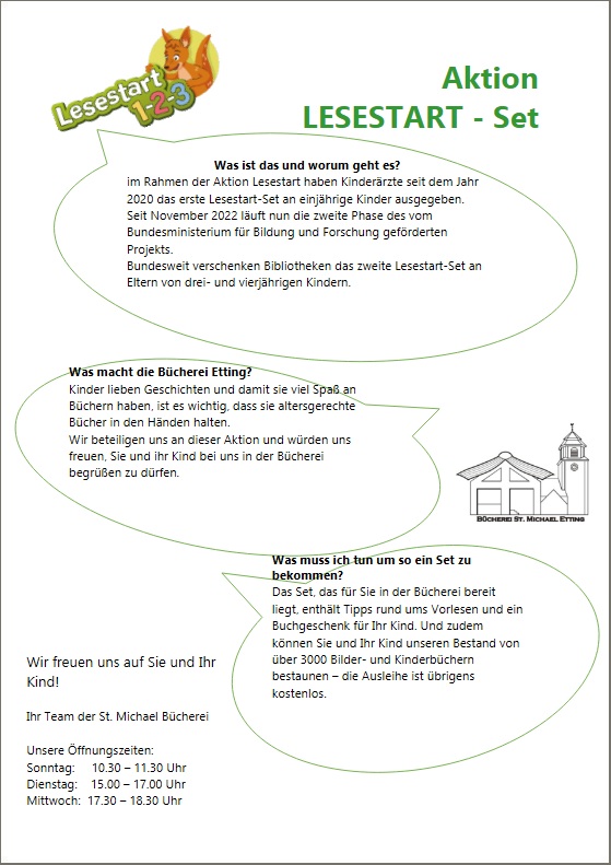 Es geht in die nächste Runde der Aktion Lesestart. Ab sofort können in der Bücherei St. Michael die von der Stiftung Lesen zur Verfügung gestellten Täschchen mit Vorlesebuch kostenlos abgeholt werden. Die Aktion wurde zur Förderung des Vorlesens geschaffen und richtet sich an Eltern mit Kindern ab 3 Jahren.