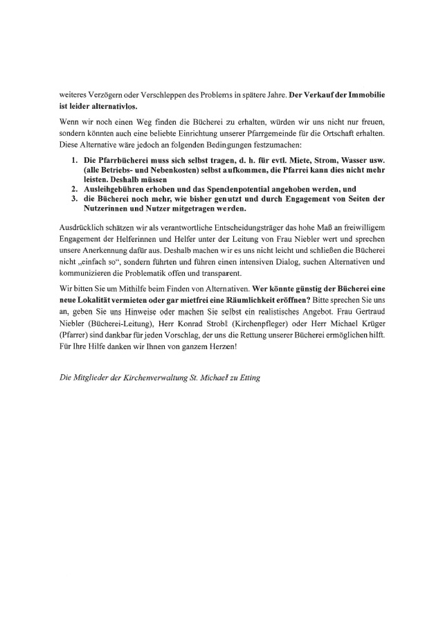 Wir bitten Sie um Mithilfe beim Finden von Alternativen. Wer könnte günstig der Bücherei eine neue Lokalität vermieten oder gar mietfrei eine Räumlichkeit eröffnen? Bitte sprechen Sie uns an, geben Sie uns Hinweise oder machen Sie selbst ein realistisches Angebot. Frau Gertraud Niebler (Bücherei-Leitung), Herr Konrad Strobl (Kirchenpfleger, pfarrei.etting@gmail.com) oder Herr Michael Krüger (Pfarrer) sind dankbar für jeden Vorschlag, der uns die Rettung unserer Bücherei ermöglichen hilft. Für Ihre Hilfe danken wir Ihnen von ganzem Herzen!