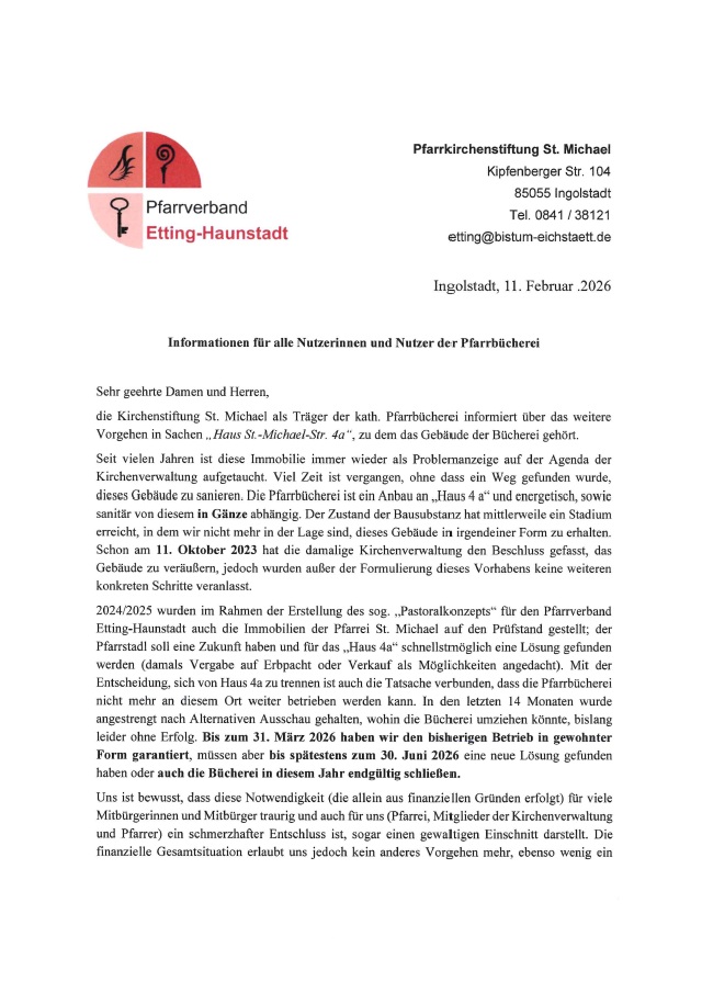 2024/2025 wurden im Rahmen der Erstellung des sogenannten „Pastoralkonzepts" für den Pfarrverband Etting-Haunstadt auch die Immobilien der Pfarrei St. Michael auf den Prüfstand gestellt; der Pfarrstadl soll eine Zukunft haben und für das „Haus 4a" schnellstmöglich eine Lösung gefunden werden (damals Vergabe auf Erbpacht oder Verkauf als Möglichkeiten angedacht). Mit der Entscheidung, sich von Haus 4a zu trennen ist auch die Tatsache verbunden, dass die Pfarrbücherei nicht mehr an diesem Ort weiter betrieben werden kann. In den letzten 14 Monaten wurde angestrengt nach Alternativen Ausschau gehalten, wohin die Bücherei umziehen könnte, bislang leider ohne Erfolg. Bis zum 31. März 2026 haben wir den bisherigen Betrieb in gewohnter Form garantiert, müssen aber bis spätestens zum 30. Juni 2026 eine neue Lösung gefunden haben oder auch die Bücherei in diesem Jahr endgültig schließen.
